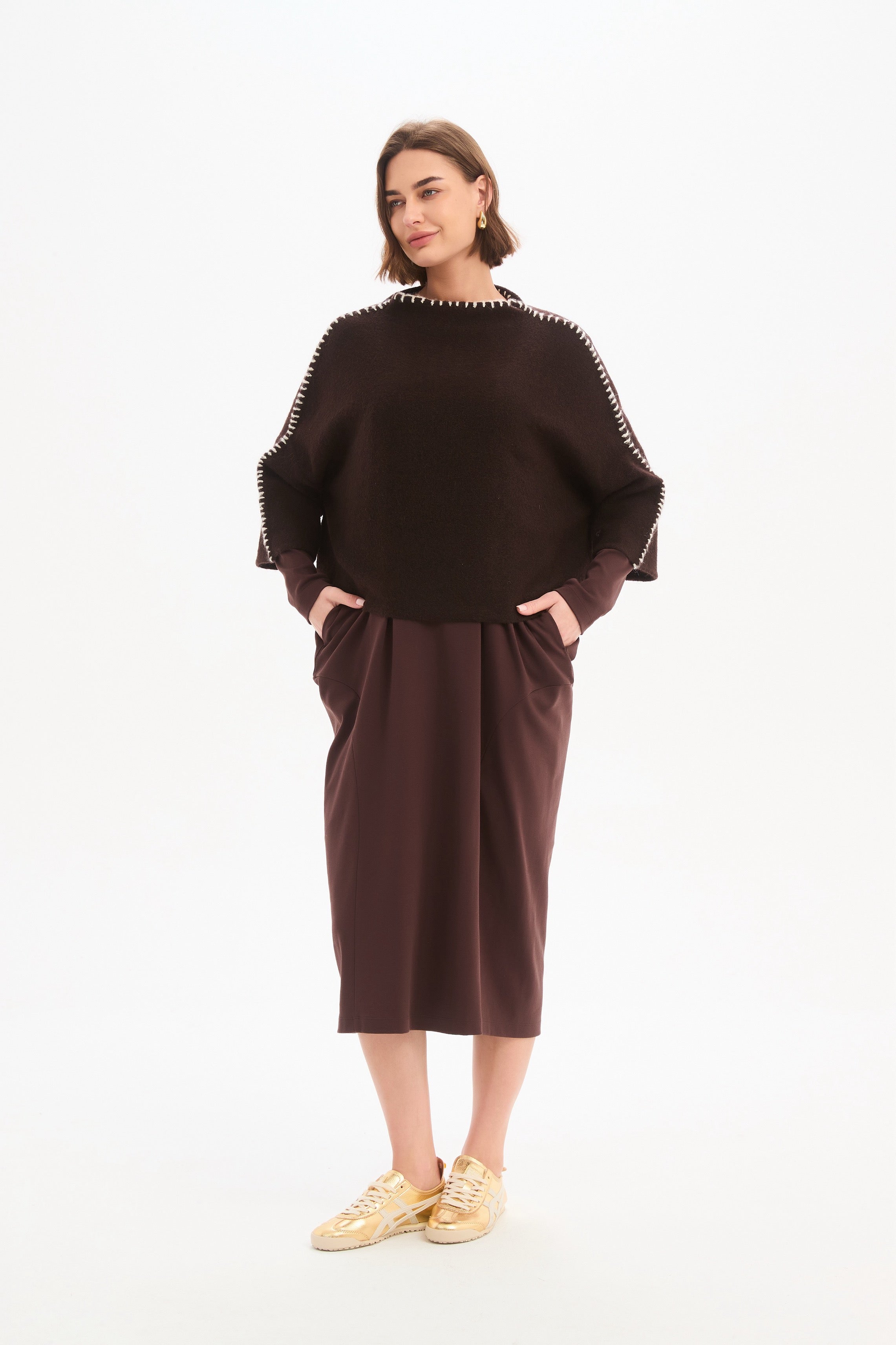 Mock Turtle Neck, Drop Shoulder, cropped length, 3/4 Sleeve ,Contrast White Blanket stitch around the neck and shoulder seam .